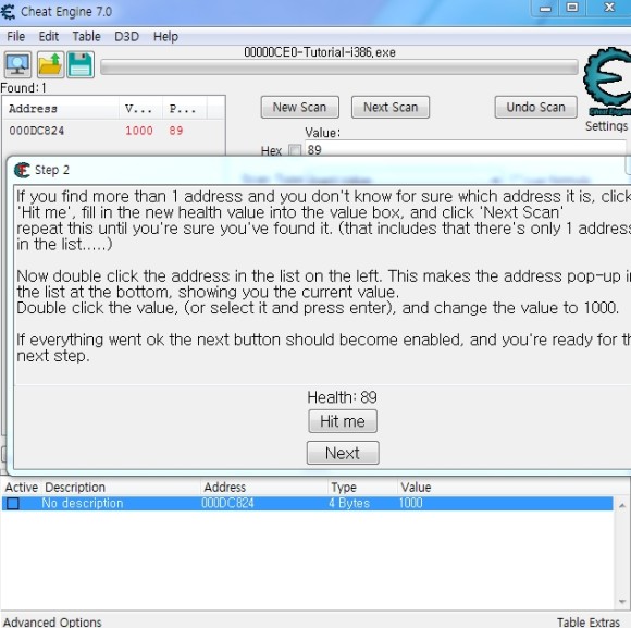 스캔하면 왼쪽 어드레스값이 뜬다. 그리고 [Hit me]을 클릭한다. (자유롭게 클릭해두 무방하다.) 그리고 난후 나는 89 까지만 클릭을하고 다시 치트엔진으로 넘어가자