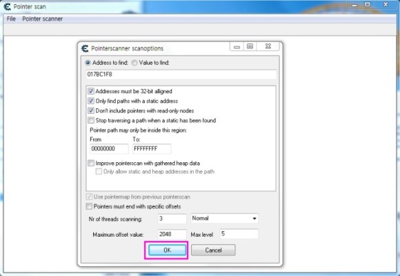 포인터 스캔 옵션을 지정해주는 창이 뜹니다!