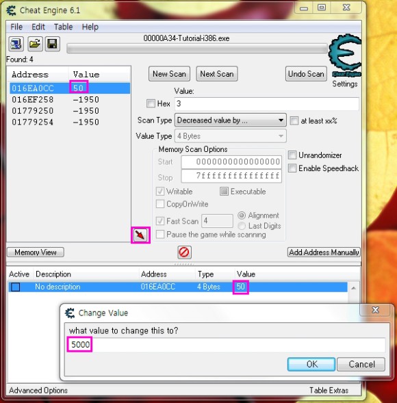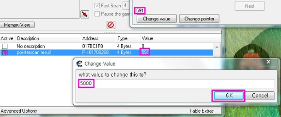 더 이상 중요들지 않으니 벨류값 눈에띄는 [50]을 더블클릭한후 벨류값을 [5000]을 하면 넥스트 스캔이 된다. 이 방법이 좀 더 빠르게 값을 찾아서 쉽네요!