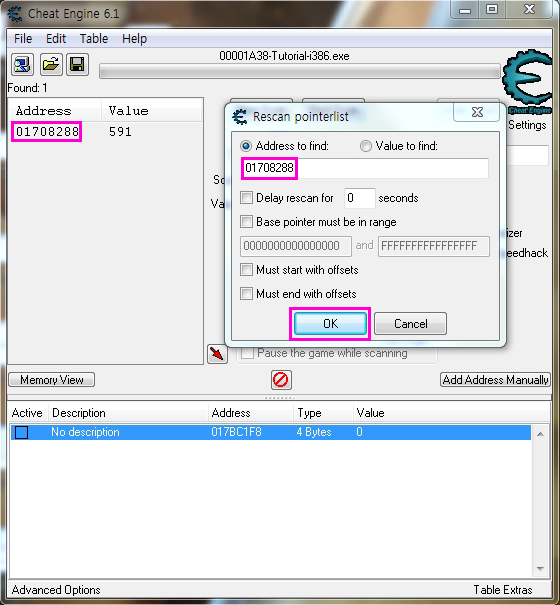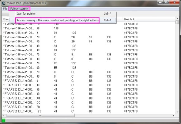 Pointer scanner 클릭후 Rescan memory - Removes pointers not pointing to the right address을 클릭해주세요.