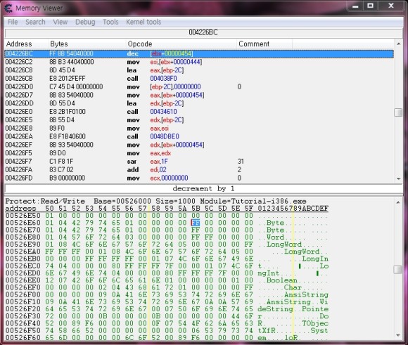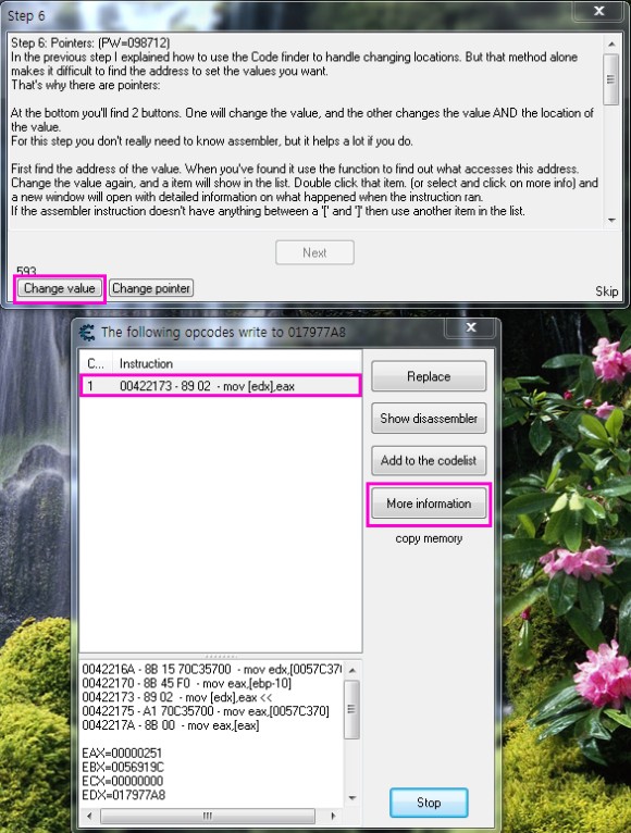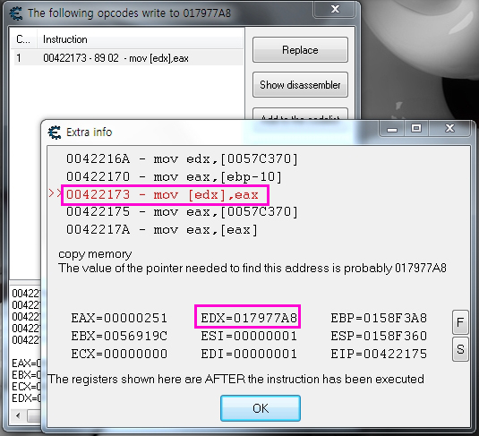 아마 튜토리얼에서Change value를 클릭하면 이놈이"Change of mov [eax],edx"라는 명령어를 따라서