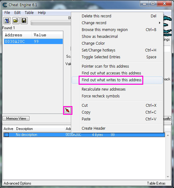더브클릭해서 치트테이블로 보낸후 오론쪽클릭후 Find out what writes to this address 클릭합니다.