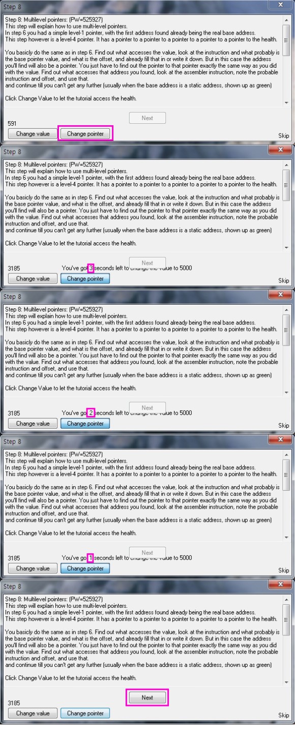 튜토리얼에서 Change pointer를 클릭시 정상대로라면 3초후 포인터가 값과 주소를 명령어대로 바꿉니다.