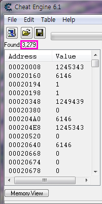 처음보는 창이 뜹니다. 이창은 메모리뷰머 (메뷰) 입니다. 게임의 정보들은 0~9 + A~F를 사용하여 16진수로 메모리에 저장됩니다.