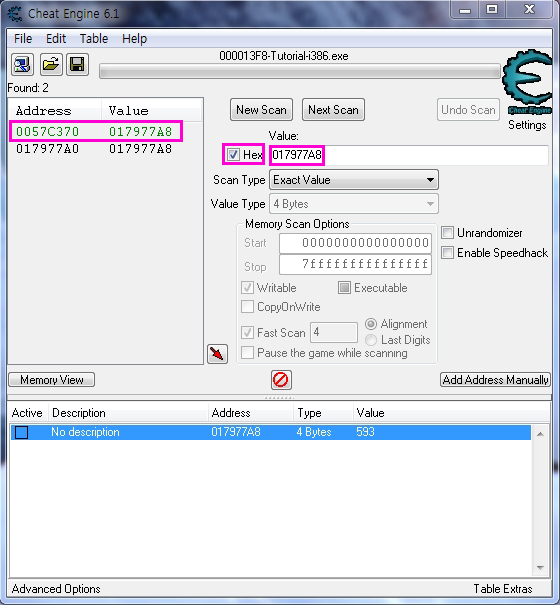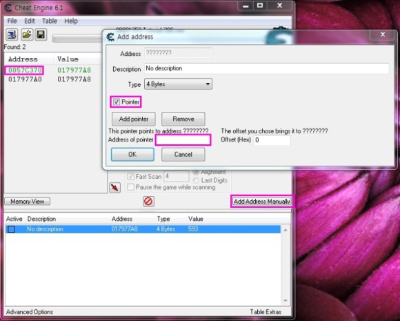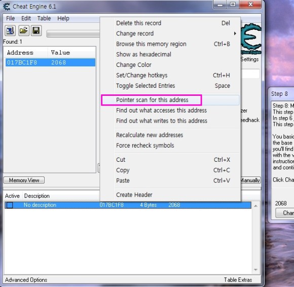 드디어 포인터를 확실하게 찾았네요. OK를 클릭해서 치트테이블에 포인터를 추가해주세요