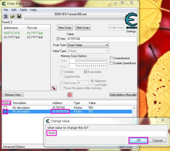 ※ active기능 사용 예로는 게임에서 총알값을 찾아냈을때 freeze에 체크하면,