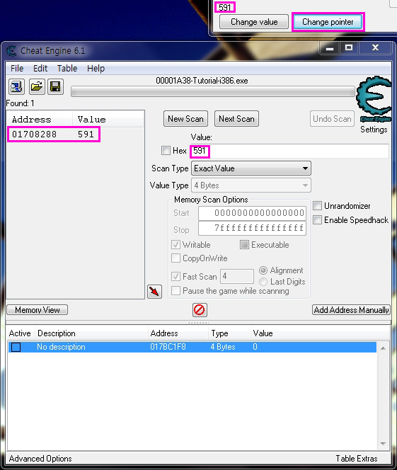 치트테이블을 보면 값의 주소가 017977A8로 포인터가 가리키는 주소와 일치한다는걸 확인 가능합니다.