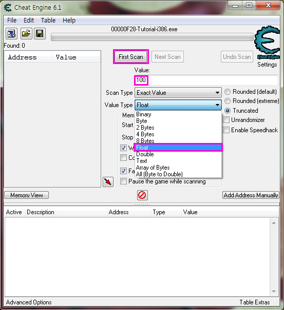 벨류 타입을 Float 을 선택하여 벨류값을 100으로선택한후 퍼스트 스캔 클릭한다.